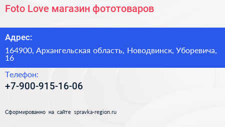 Foto Love, магазин фототоваров по адресу 164900, Архангельская область, Новодвинск, Уборевича, 16 в дальнейшем Организация, размещена в следующих категориях: