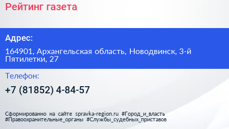 Рейтинг, газета по адресу 164901, Архангельская область, Новодвинск, 3-й Пятилетки, 27 в дальнейшем Организация, размещена в следующих категориях: