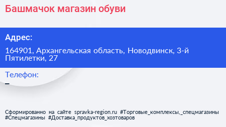 Башмачок, магазин обуви по адресу 164901, Архангельская область, Новодвинск, 3-й Пятилетки, 27 в дальнейшем Организация, размещена в следующих категориях: