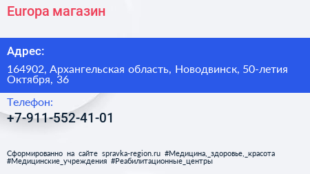 Europa, магазин по адресу 164902, Архангельская область, Новодвинск, 50-летия Октября, 36 в дальнейшем Организация, размещена в следующих категориях: