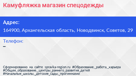 Камуфляжка, магазин спецодежды по адресу 164900, Архангельская область, Новодвинск, Советов, 29 в дальнейшем Организация, размещена в следующих категориях:
