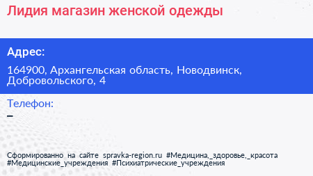 Лидия, магазин женской одежды по адресу 164900, Архангельская область, Новодвинск, Добровольского, 4 в дальнейшем Организация, размещена в следующих категориях: