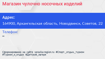 Магазин чулочно-носочных изделий по адресу 164900, Архангельская область, Новодвинск, Советов, 22 в дальнейшем Организация, размещена в следующих категориях: