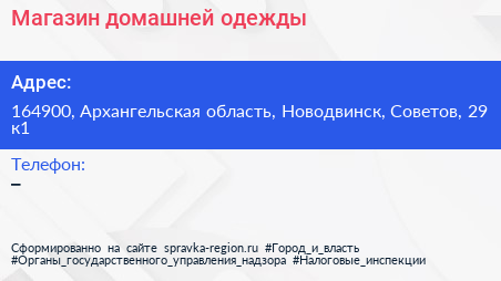 Магазин домашней одежды по адресу 164900, Архангельская область, Новодвинск, Советов, 29 к1 в дальнейшем Организация, размещена в следующих категориях: