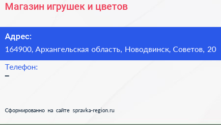 Магазин игрушек и цветов по адресу 164900, Архангельская область, Новодвинск, Советов, 20 в дальнейшем Организация, размещена в следующих категориях: