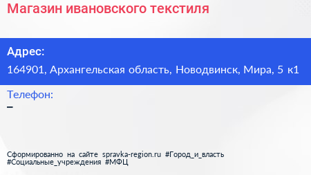 Магазин ивановского текстиля по адресу 164901, Архангельская область, Новодвинск, Мира, 5 к1 в дальнейшем Организация, размещена в следующих категориях:
