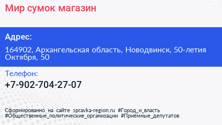 Мир сумок, магазин по адресу 164902, Архангельская область, Новодвинск, 50-летия Октября, 50 в дальнейшем Организация, размещена в следующих категориях: