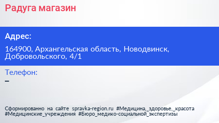 Радуга, магазин по адресу 164900, Архангельская область, Новодвинск, Добровольского, 4/1 в дальнейшем Организация, размещена в следующих категориях: