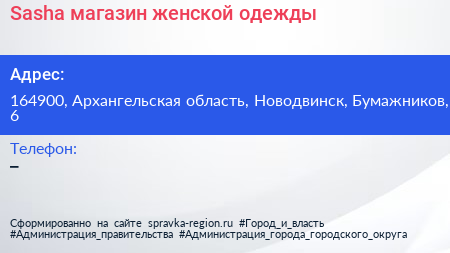 Sasha, магазин женской одежды по адресу 164900, Архангельская область, Новодвинск, Бумажников, 6 в дальнейшем Организация, размещена в следующих категориях: