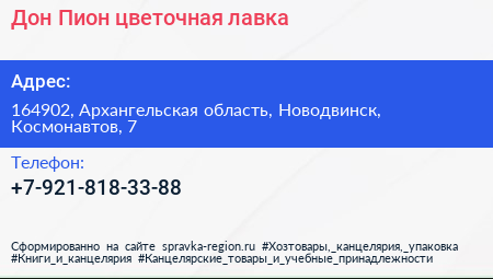 Дон Пион, цветочная лавка по адресу 164902, Архангельская область, Новодвинск, Космонавтов, 7 в дальнейшем Организация, размещена в следующих категориях: