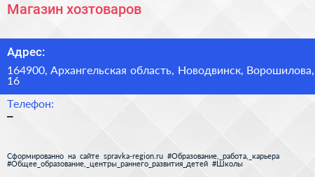 Магазин хозтоваров по адресу 164900, Архангельская область, Новодвинск, Ворошилова, 16 в дальнейшем Организация, размещена в следующих категориях: