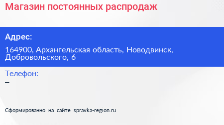 Магазин постоянных распродаж по адресу 164900, Архангельская область, Новодвинск, Добровольского, 6 в дальнейшем Организация, размещена в следующих категориях: