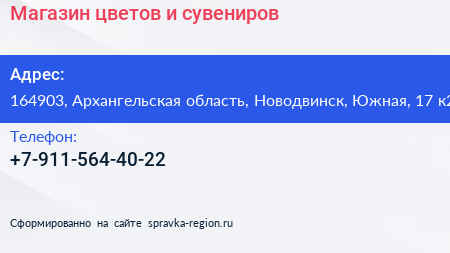 Магазин цветов и сувениров по адресу 164903, Архангельская область, Новодвинск, Южная, 17 к2 в дальнейшем Организация, размещена в следующих категориях: