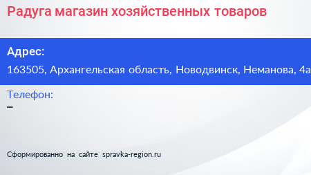 Радуга, магазин хозяйственных товаров по адресу 163505, Архангельская область, Новодвинск, Неманова, 4а в дальнейшем Организация, размещена в следующих категориях: