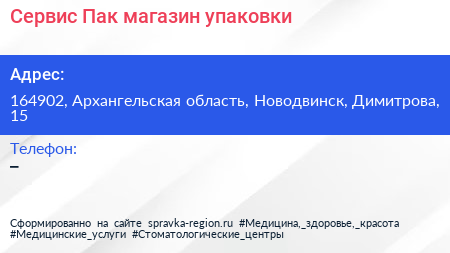 Сервис-Пак, магазин упаковки по адресу 164902, Архангельская область, Новодвинск, Димитрова, 15 в дальнейшем Организация, размещена в следующих категориях: