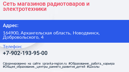 Сеть магазинов радиотоваров и электротехники по адресу 164900, Архангельская область, Новодвинск, Добровольского, 4 в дальнейшем Организация, размещена в следующих категориях: