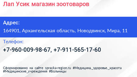 Лап-Усик, магазин зоотоваров по адресу 164901, Архангельская область, Новодвинск, Мира, 11 в дальнейшем Организация, размещена в следующих категориях: