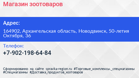 Магазин зоотоваров по адресу 164902, Архангельская область, Новодвинск, 50-летия Октября, 36 в дальнейшем Организация, размещена в следующих категориях: