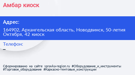 Амбар, киоск по адресу 164902, Архангельская область, Новодвинск, 50-летия Октября, 42 киоск в дальнейшем Организация, размещена в следующих категориях: