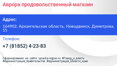 Аврора, продовольственный магазин по адресу 164902, Архангельская область, Новодвинск, Димитрова, 15 в дальнейшем Организация, размещена в следующих категориях: