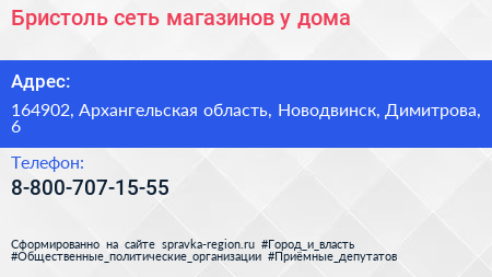 Бристоль, сеть магазинов у дома по адресу 164902, Архангельская область, Новодвинск, Димитрова, 6 в дальнейшем Организация, размещена в следующих категориях: