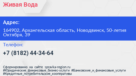 Живая Вода по адресу 164902, Архангельская область, Новодвинск, 50-летия Октября, 39 в дальнейшем Организация, размещена в следующих категориях: