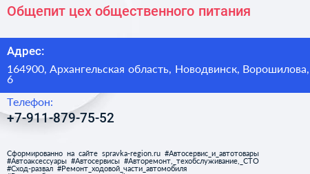 Общепит, цех общественного питания по адресу 164900, Архангельская область, Новодвинск, Ворошилова, 6 в дальнейшем Организация, размещена в следующих категориях: