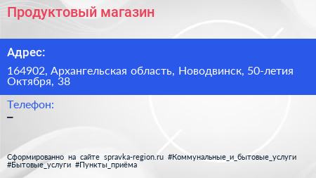 Продуктовый магазин по адресу 164902, Архангельская область, Новодвинск, 50-летия Октября, 38 в дальнейшем Организация, размещена в следующих категориях:
