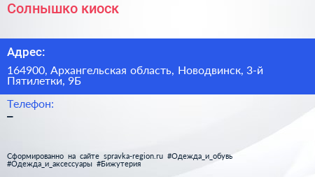 Солнышко, киоск по адресу 164900, Архангельская область, Новодвинск, 3-й Пятилетки, 9Б в дальнейшем Организация, размещена в следующих категориях: