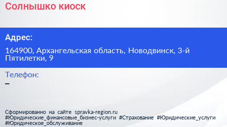 Солнышко, киоск по адресу 164900, Архангельская область, Новодвинск, 3-й Пятилетки, 9 в дальнейшем Организация, размещена в следующих категориях: