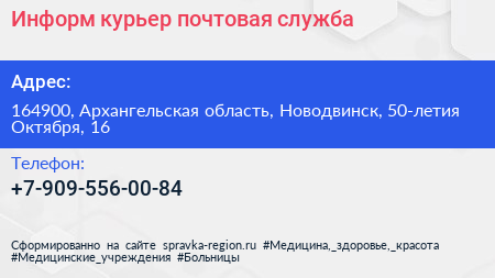 Информ-курьер, почтовая служба по адресу 164900, Архангельская область, Новодвинск, 50-летия Октября, 16 в дальнейшем Организация, размещена в следующих категориях:
