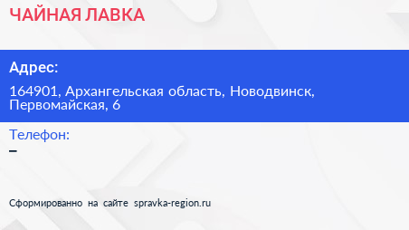ЧАЙНАЯ ЛАВКА по адресу 164901, Архангельская область, Новодвинск, Первомайская, 6 в дальнейшем Организация, размещена в следующих категориях:
