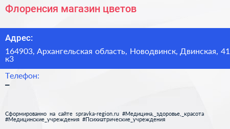 Флоренсия, магазин цветов по адресу 164903, Архангельская область, Новодвинск, Двинская, 41 к3 в дальнейшем Организация, размещена в следующих категориях: