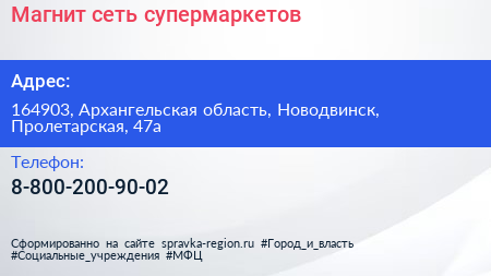 Магнит, сеть супермаркетов по адресу 164903, Архангельская область, Новодвинск, Пролетарская, 47а в дальнейшем Организация, размещена в следующих категориях: