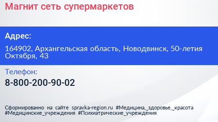 Магнит, сеть супермаркетов по адресу 164902, Архангельская область, Новодвинск, 50-летия Октября, 43 в дальнейшем Организация, размещена в следующих категориях:
