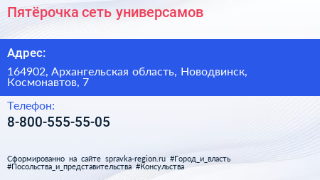 Пятёрочка, сеть универсамов по адресу 164902, Архангельская область, Новодвинск, Космонавтов, 7 в дальнейшем Организация, размещена в следующих категориях: