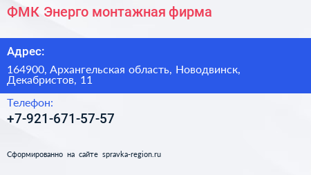 ФМК-Энерго, монтажная фирма по адресу 164900, Архангельская область, Новодвинск, Декабристов, 11 в дальнейшем Организация, размещена в следующих категориях: