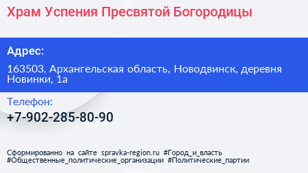 Храм Успения Пресвятой Богородицы по адресу 163503, Архангельская область, Новодвинск, деревня Новинки, 1а в дальнейшем Организация, размещена в следующих категориях: