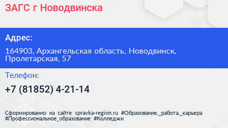 ЗАГС г. Новодвинска по адресу 164903, Архангельская область, Новодвинск, Пролетарская, 57 в дальнейшем Организация, размещена в следующих категориях: