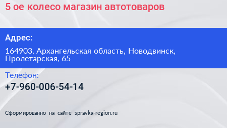 5-ое колесо, магазин автотоваров по адресу 164903, Архангельская область, Новодвинск, Пролетарская, 65 в дальнейшем Организация, размещена в следующих категориях: