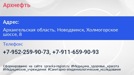 Архнефть по адресу Архангельская область, Новодвинск, Холмогорское шоссе, 8 в дальнейшем Организация, размещена в следующих категориях: