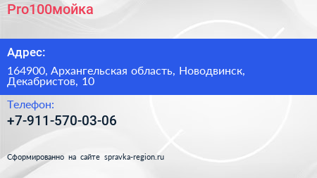 Pro100мойка по адресу 164900, Архангельская область, Новодвинск, Декабристов, 10 в дальнейшем Организация, размещена в следующих категориях: