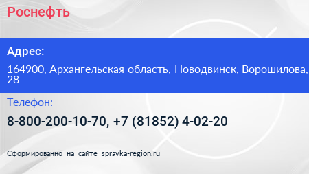 Роснефть по адресу 164900, Архангельская область, Новодвинск, Ворошилова, 28 в дальнейшем Организация, размещена в следующих категориях:
