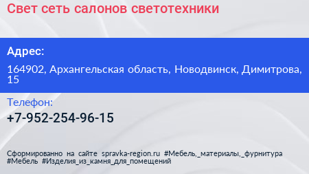 Свет, сеть салонов светотехники по адресу 164902, Архангельская область, Новодвинск, Димитрова, 15 в дальнейшем Организация, размещена в следующих категориях: