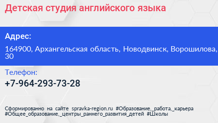 Детская студия английского языка по адресу 164900, Архангельская область, Новодвинск, Ворошилова, 30 в дальнейшем Организация, размещена в следующих категориях: