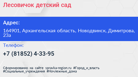 Лесовичок, детский сад по адресу 164901, Архангельская область, Новодвинск, Димитрова, 23а в дальнейшем Организация, размещена в следующих категориях:
