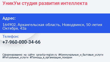 УникУм, студия развития интеллекта по адресу 164902, Архангельская область, Новодвинск, 50-летия Октября, 43а в дальнейшем Организация, размещена в следующих категориях: