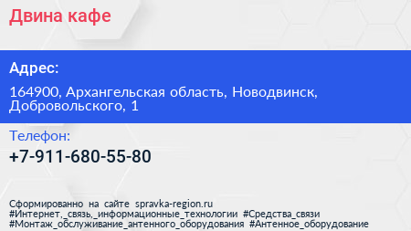 Двина, кафе по адресу 164900, Архангельская область, Новодвинск, Добровольского, 1 в дальнейшем Организация, размещена в следующих категориях: