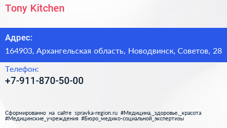 Tony Kitchen по адресу 164903, Архангельская область, Новодвинск, Советов, 28 в дальнейшем Организация, размещена в следующих категориях: