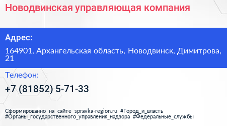 Новодвинская управляющая компания по адресу 164901, Архангельская область, Новодвинск, Димитрова, 21 в дальнейшем Организация, размещена в следующих категориях: